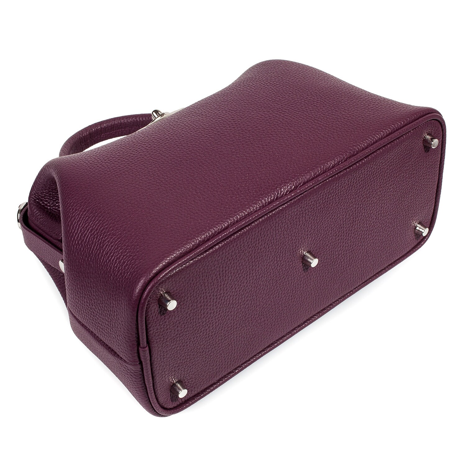 Women's leather doctor bag made of genuine leather, hardware with galvanic coating and microfiber lining. The internal space of a bag is equipped with one spacious compartment, two patch-pockets and one zipper pocket. The bag is closed with a clasp. The kit also includes a storage bag.